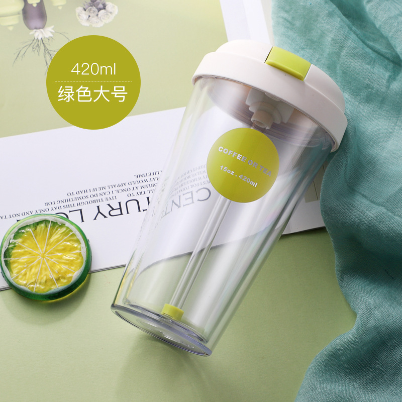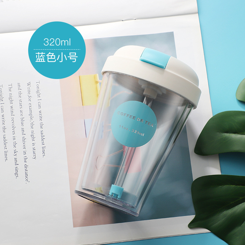 雙層塑料杯翻蓋吸管水杯學生兒童便攜水杯奶茶果汁簡約杯子
